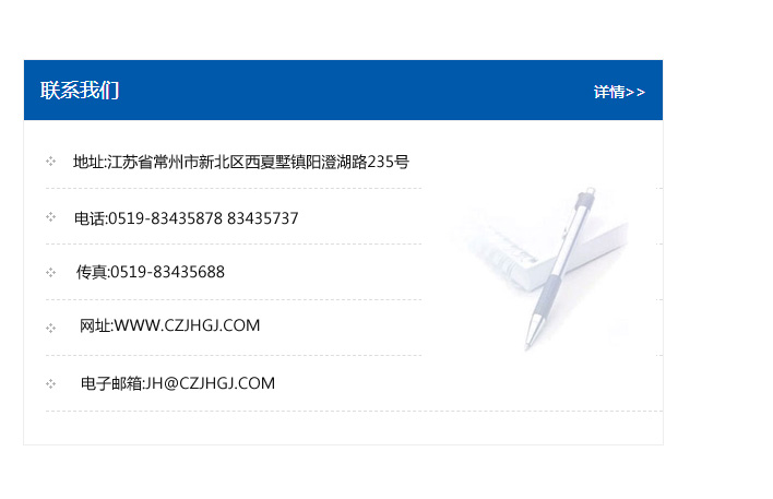 地址:常州市新北區友邦商務大廈1幢16、17層  電話:0519-85101652  傳真:0519-85112595  郵編:213022  網址:www_cz-jiayue_cn.cssuda.com  郵箱:xiajifengaa@163.com